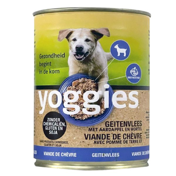 Blikvoer voor honden met kwaliteitsgeitenvlees , aardappelen en wortelen zonder conserveringsmiddelen of smaakstoffen . Yoggies hondenvoer in blik bevat alleen stukjes vlees (groter en kleiner) en natuurlijke vlees- en bottenbouillon.