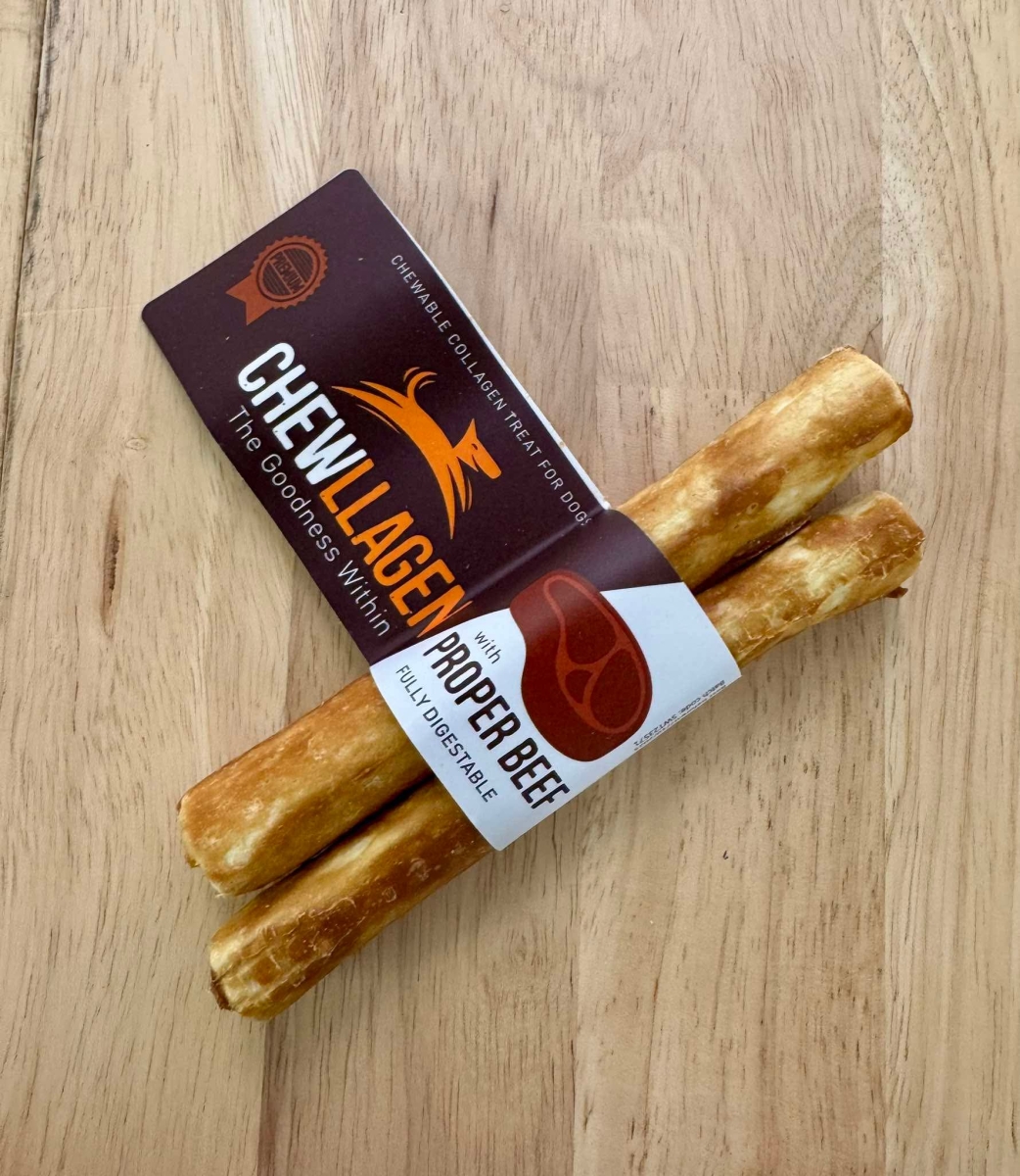Chewllagen is een hondensnack gemaakt van collageen dat wordt gewonnen uit de huid van Zuid-Amerikaans grasgevoerd rund.