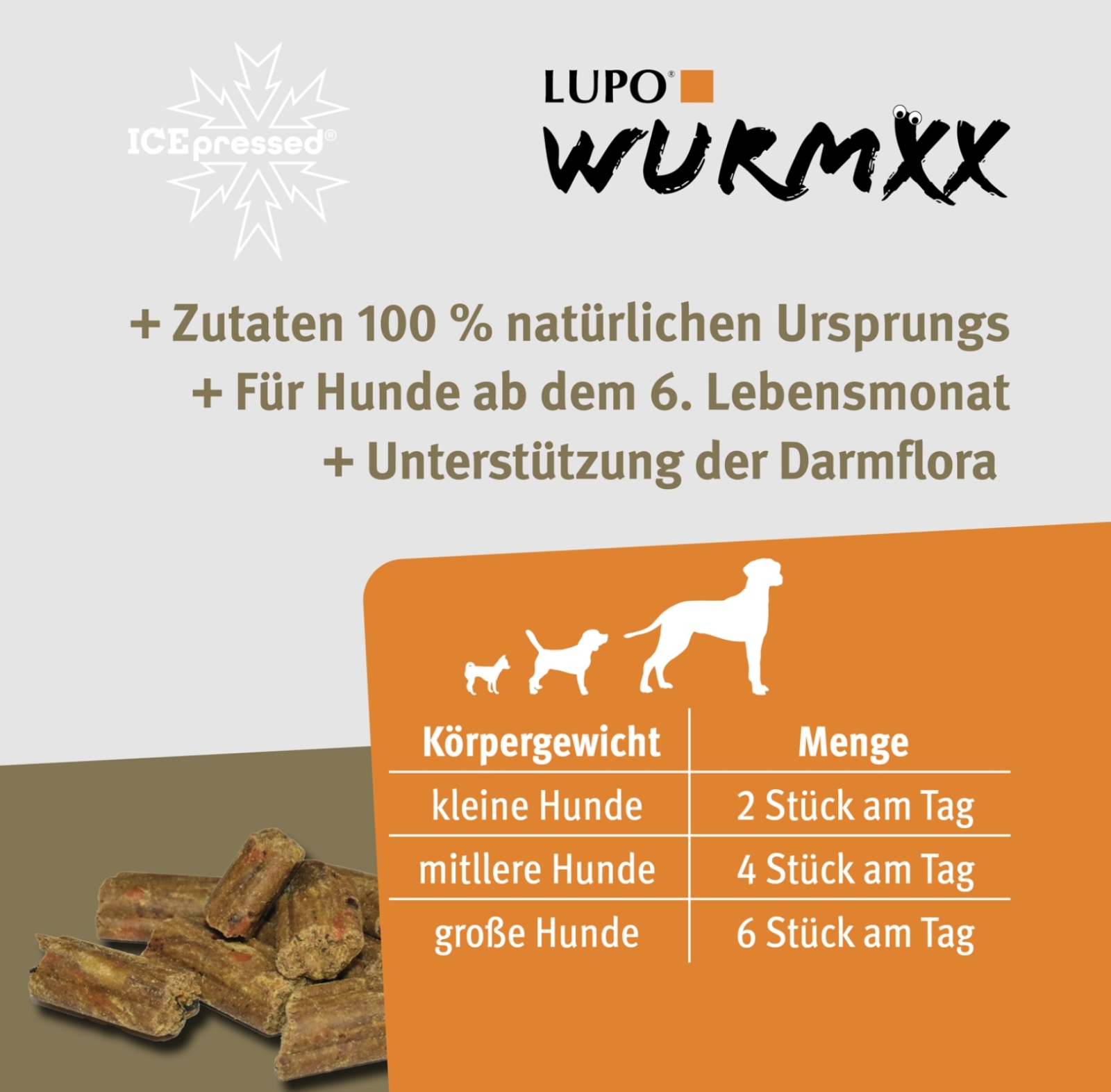 Onze LUPO® WURMXX Snack bevat een speciale selectie van ingrediënten van natuurlijke oorsprong, die