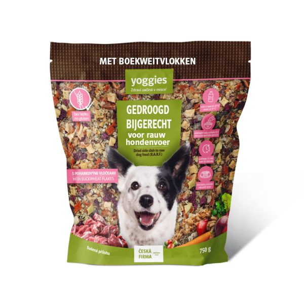 Yoggies droog bijgerecht met boekweitvlokken is een optimale aanvulling op de BARF rauwvleesvoeding.ย