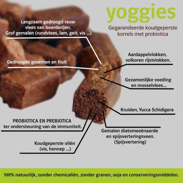Yoggies korrels worden op een milde manier geproduceerd: door middel van koude persing. Hierdoor behouden ze hun natuurlijke vleessmaak en belangrijke voedingsstoffen. Ze worden uitsluitend gemaakt van hoogwaardige landbouwingrediรซnten, zonder granen, soja of kunstmatige ingrediรซnten. Ze bevatten 86% kwaliteitsvlees (vรณรณr het drogen). De korrels zijn gemakkelijk verteerbaar en versterken dankzij de probiotica de immuniteit en een gezonde spijsvertering bij honden van elke leeftijd. Lees hieronder waarom uw hond er dol op zal zijn.