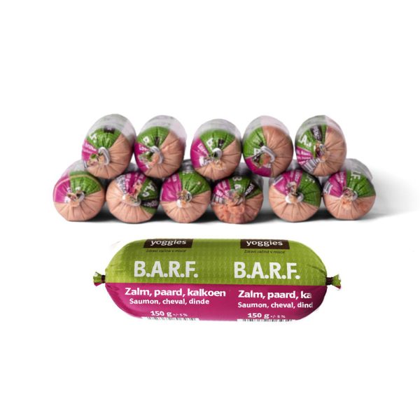 Rauwe voeding voor honden (Yoggies BARF) met probiotica. De recepten zijn ontwikkeld om het natuurlijke dieet van een hond zo goed mogelijk te benaderen en bevatten uitsluitend vlees van hoge kwaliteit, afkomstig van gecontroleerde fokkerij. Ze bevatten speciale probiotica voor honden die de immuniteit en weerstand tegen virussen, parasieten en ziektes ondersteunen.