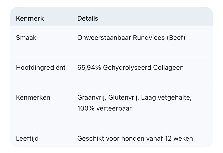 Collageen (65,94%), rundvlees (26,37%), tapioca (2,93%), cellulose (2,93%), kaolien (0,735%), vitaminen (0,365%), aroma’s (0,365%), conserveermiddel: sorbinezuur (0,365%).