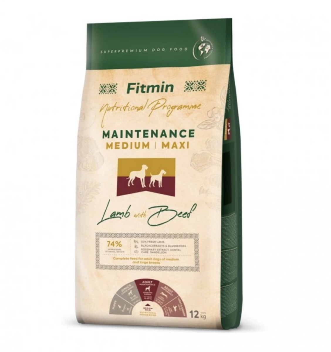 Het superpremium Medium Maxi Onderhoudsvoer uit de Fitmin Voedingsprogramma Lam met Rundvlees-lijn bevat een hoog percentage lam en rundvlees in combinatie met rijst en erwten. Het voer is speciaal ontwikkeld voor volwassen honden van middelgrote en grote rassen (vanaf 15 kg) met een normale hoeveelheid beweging, in de leeftijd van 1 tot 7 jaar.