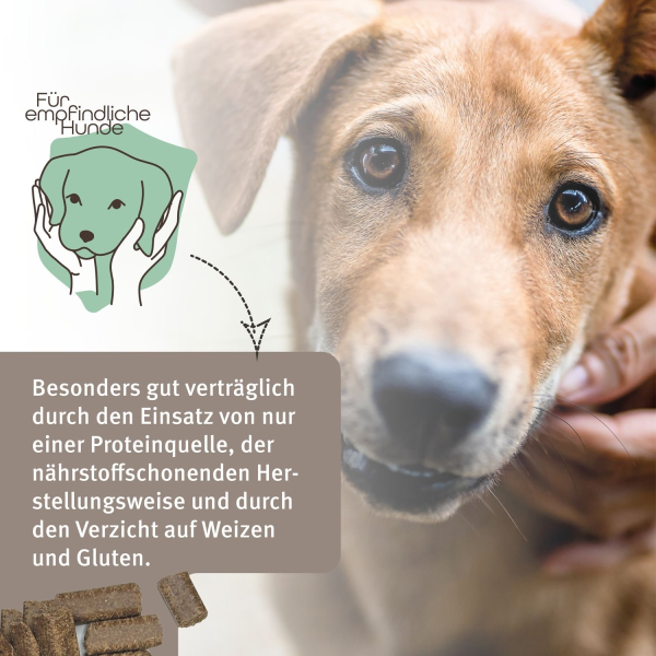 Voor gevoelige honden – Bijzonder goed te verdragen door het gebruik van slechts één eiwitbron, de voedingswaardebehoudende productiemethode en de afwezigheid van tarwe en gluten.