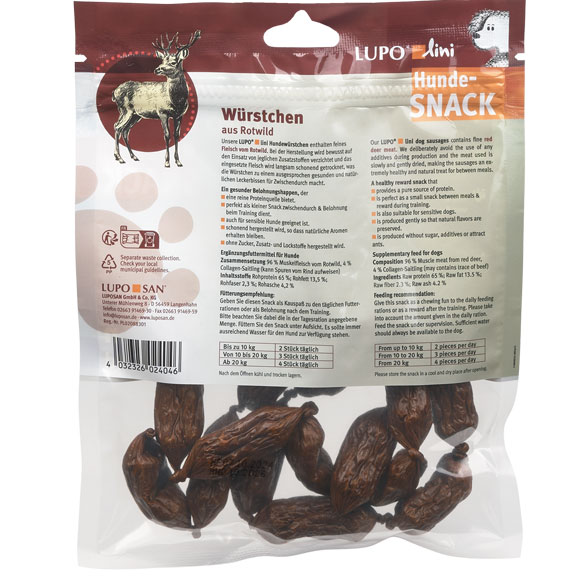Onze LUPOlini hondenworstjesย bevatten fijn edelhertvlees. Tijdens de productie worden geen toevoegingen gebruikt en het gebruikte vlees wordt langzaam en voorzichtig gedroogd, waardoor de worsten een uiterst gezonde en natuurlijke lekkernij zijn voor tussendoor.