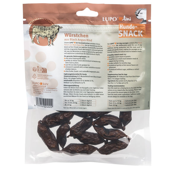Onze LUPOlini hondenworstjes bevatten fijn vlees van Black Angus rundvlees. Tijdens de productie worden geen toevoegingen gebruikt en het gebruikte vlees wordt langzaam en voorzichtig gedroogd, waardoor de worsten een uiterst gezonde en natuurlijke lekkernij zijn voor tussendoor.