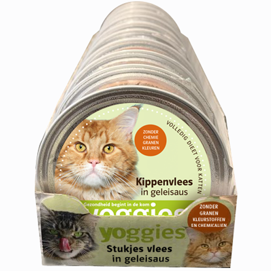 Pakket met Yoggies kattencups met sappige kip en vooral heerlijke gelei-saus. De populaire Yoggies Cups zijn ongetwijfeld een traktatie voor alle katten. Het vlees komt van gecontroleerde Europese boerderijen en de geleisaus wordt gemaakt van de bouillon van dit vlees, botten en kwaliteitsgroenten. Deze bakjes en hun inhoud kunnen als complete voeding voor katten dienen, omdat ze essentiรซle voedingsstoffen bevatten, waaronder: het aminozuur Taurine.