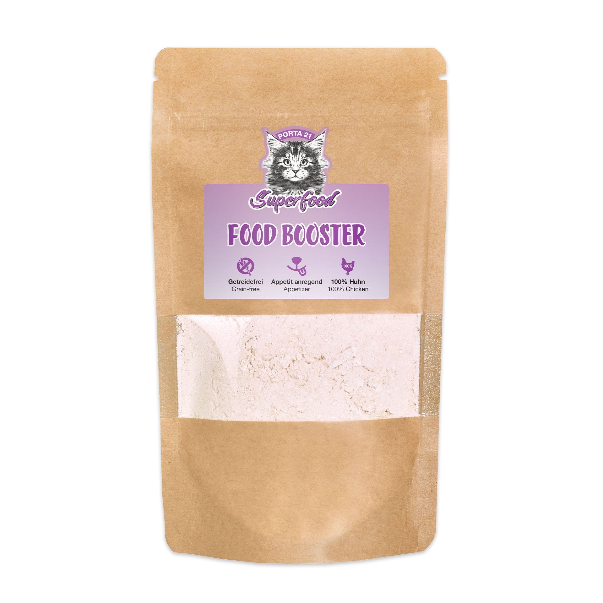 De Superfood Food Booster is een fijn poeder gemaakt van 100% puur, gedroogd kippenvlees en bevat geen smaakversterkers, bewaarmiddelen of additieven. Deze natuurlijke samenstelling volgt de natuurlijke voeding van katten en honden en voorziet uw huisdier bovendien van waardevolle dierlijke eiwitten die de ontwikkeling en regeneratie van spieren en botten ondersteunen.