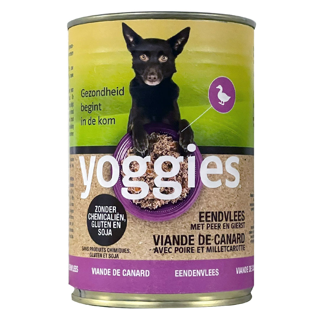 Blikvoer voor honden met kwaliteits eendenvleesย , peer en gierst, zonder conserveringsmiddelen of smaakstoffenย . Yoggies hondenvoer in blik bevat alleenย stukjes vleesย (groter en kleiner) en natuurlijke vlees- en bottenbouillon.
